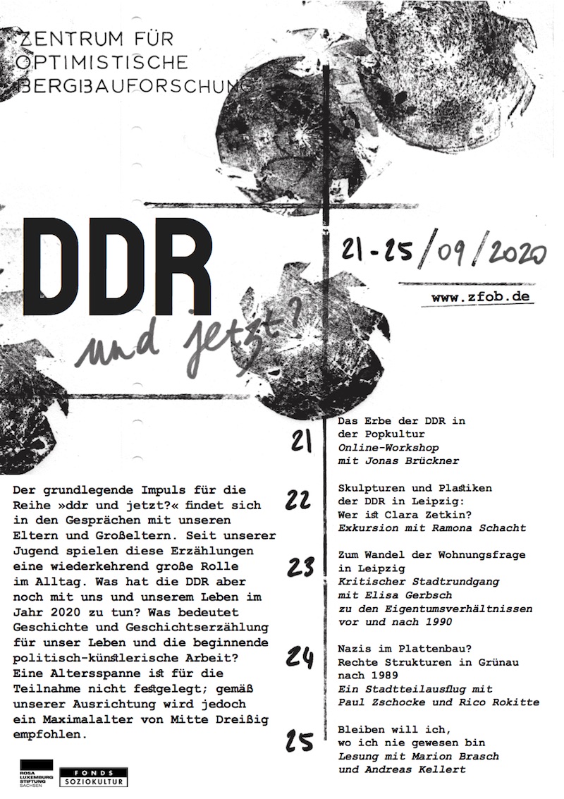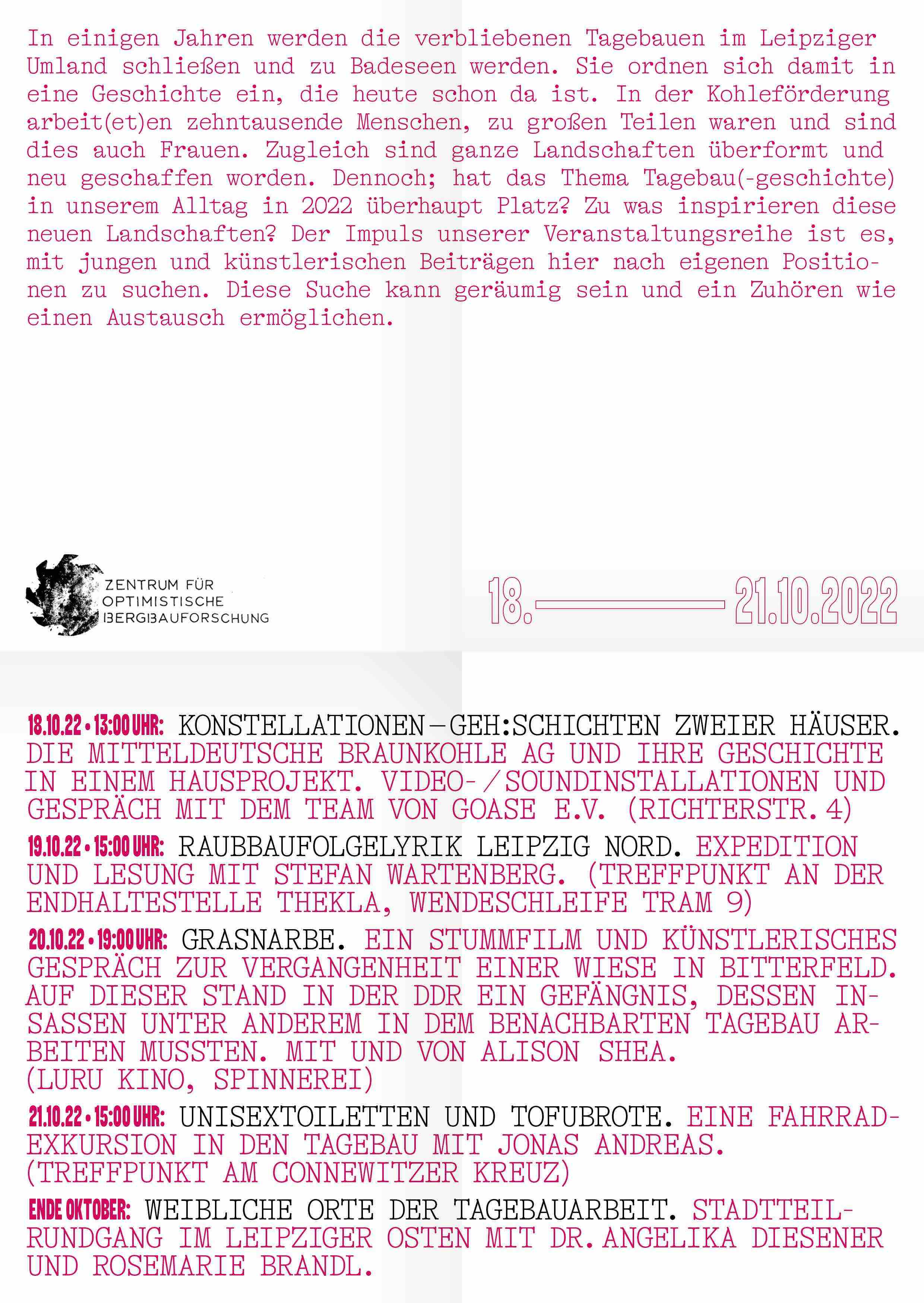 Als Aktive des Zentrums für optimistische Bergbauforschung e.V. (zfob) gehen wir mit offenen Augen durch die Stadt, ihre Umgebung und ihre Geschichte. Unsere bisherigen Projekte zu Industriearbeit, Tagebau und Fotografie sollen das neue Alte freilegen, und darüber festgelegte Sichtweisen sprengen. Seit mehreren Jahren führen wir mit Studierenden (u.a. HGB Leipzig, HS Merseburg, HTWK Leipzig, Bauhaus-Universität Weimar, FH Campus Wien) urbane Interventionen und künstlerische Workshops in Leipzig durch – deren Inhalt immer auch eine Bewusstseinswerdung über individuelle und strukturelle Problemlagen in den Krisen der Gegenwart ist. Ziel ist es, für Leipzig und seine Bewohner:innen einen Blick auf (Arbeits- und Tagebau-)Geschichte offenzulegen, mit dem sie sich selbst zum Objekt der Betrachtung machen: Was lerne ich aus den Biografien der Menschen für meine eigene Biografie und was erkenne ich, wenn ich auf eine vorschnelle Deutung verzichte?